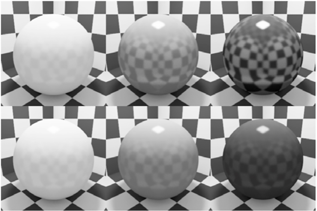 - „Bildschärfeglanz": Empfundene Schärfe der reflektierten Objekte (je schärfer, desto störender) (Original: DOI gloss (DOI: distinctness of image))