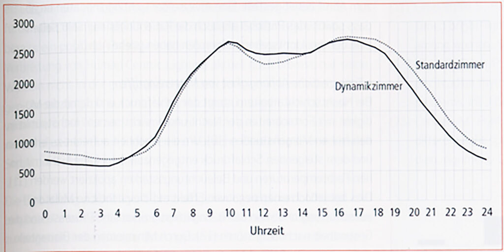 Das Bild will zeigen, wie sich die betrachteten Fälle (was 3000 bedeuten steht leider nicht im Original) über 24 Stunden unterschiedlich je nach Art der Beleuchtung entwickeln.
