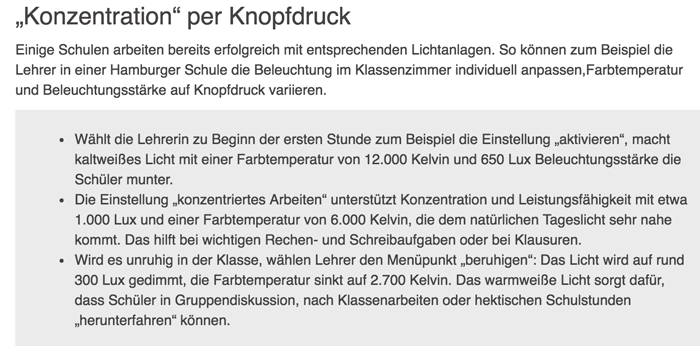 So kam es zu der Sache mit Untersuchung der Aufmerksamkeit. In drei Schulen wurden Kinder unter „dynamisches“ blaues Licht gesetzt, wobei sie einen Aufmerksamkeitsbelastungstest ausführten. Dieser Test, d2-Test, ist zwar von seinem Autor Brickenkamp für den sog. Idiotentest für den TÜV erstellt worden. Wer wird denn schon wissen, dass er nicht für Kinder validert ist. Zudem hat er einen gewaltigen Mangel für den diesmal vorgesehenen Zweck: Der d2-Test ist bekannt für seine Anfälligkeit bei Wiederholungen. Beim TÜV absolvierte man den nur einmal. Bei dem fraglichen Versuch mussten die Kinder zweimal denselben Test absolvieren, um eben den Unterschied von 44% zu dokumentieren.