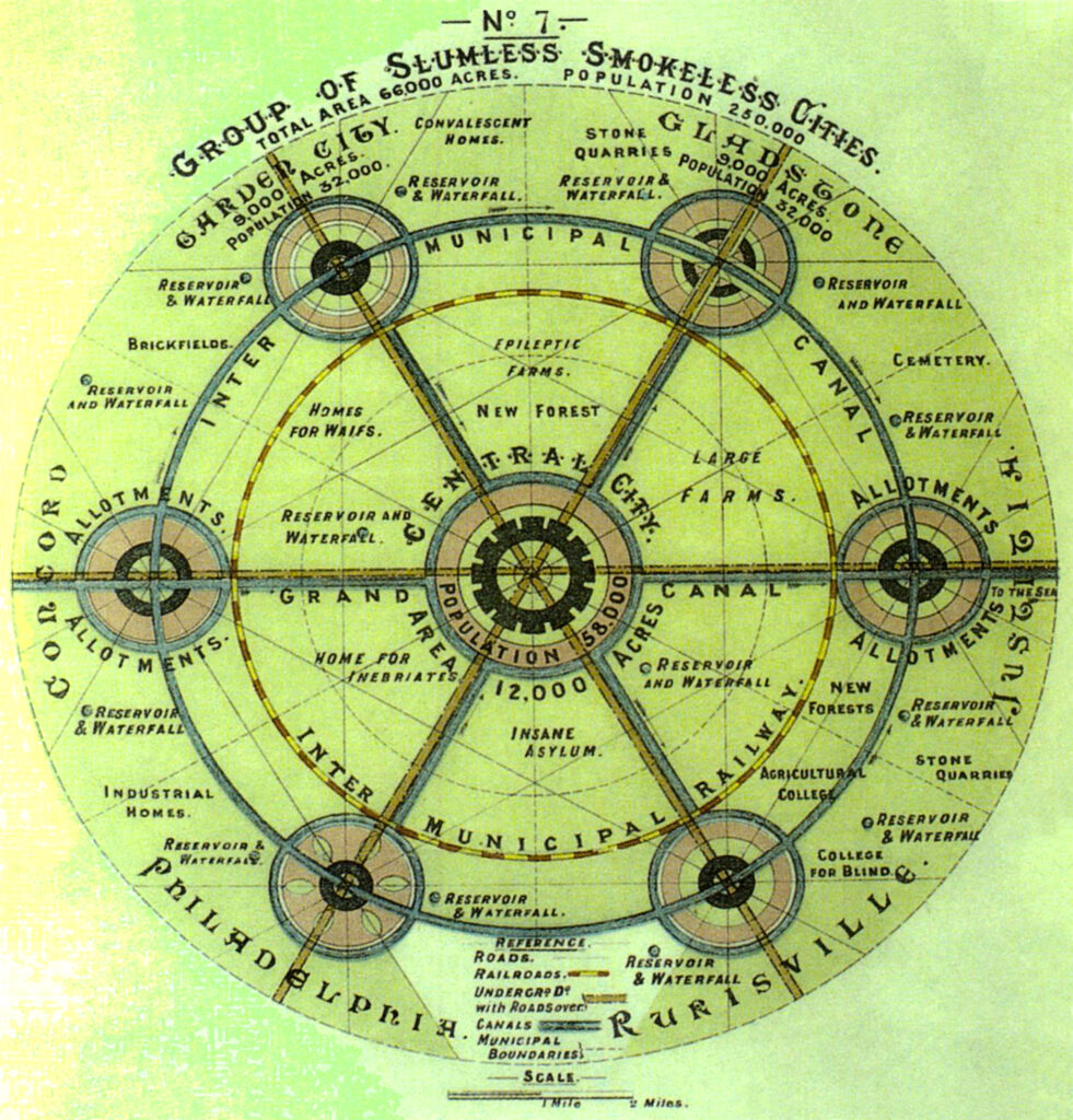 Die Gartenstadtidee aus England (1913) umfasste die ganze Welt. Ihr Konzept baute auf einer dezentralen Anordnung kleiner Siedlungen um große herum. |