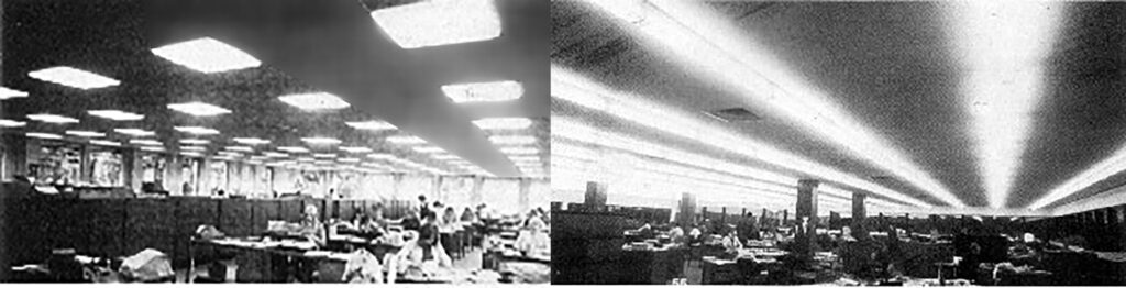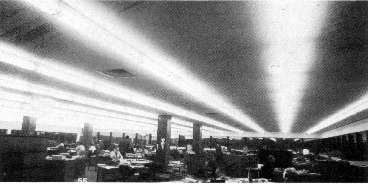 Seit dem Ende des 19. Jhdts. wurden Büros zunehmend ohne Fenster gebaut. Die fehlenden Anreize durch Wind und Wetter sollten durch den Luftzug durch die Klimaanlage und die Geräusche aus Maschinen ersetzt werden |