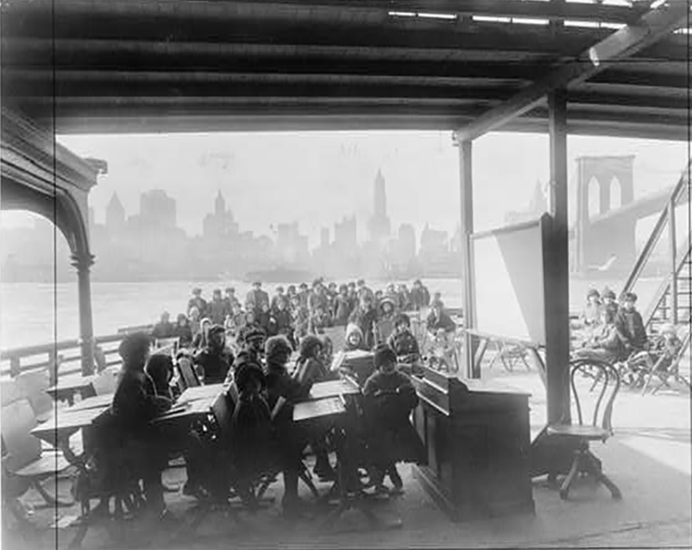 Man versuchte, mit allen Mitteln, heilende Strahlen der Sonne in die Gebäude zu holen. Hier ist eine Frischluftklasse aus Chicago im Winter. Man versuchte, sogar den Unterricht an die frische Sonne zu verlegen, wie z.B. auf dieses Schiff. man baute Waldschulen. |