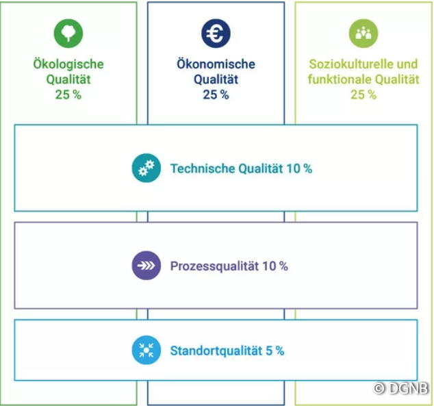 Just das wurde in dem DGNB -System realisiert. Das System bewertet die Qualität eines Gebäudes gleichwertig nach drei Hauptdimensionen: