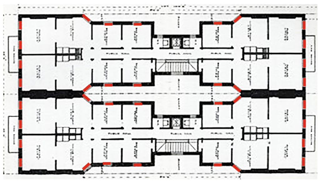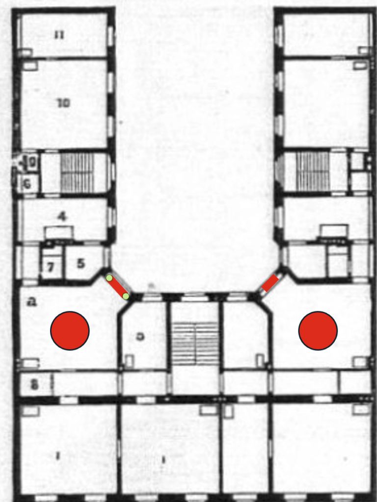 Die Gebäude erhielten den Namen Hundeknochen oder Hanteln wegen der Form. Die rot eingezeichneten Fenster guckten zwar ins Freie, aber wenige Meter auf der anderen Seite waren andere Fenster. Der Raum zwischen zwei Hundeknochen war ein Schacht, der bald voll Müll war. So hat man dem Gesetz genüge getan. Aber viel Licht kam nicht in die Wohnungen, weil Licht in einem Schacht nur eine Richtung kennt, nach unten. Bei den schräg eingezeichneten Fenstern konnte man sich die Hand reichen.