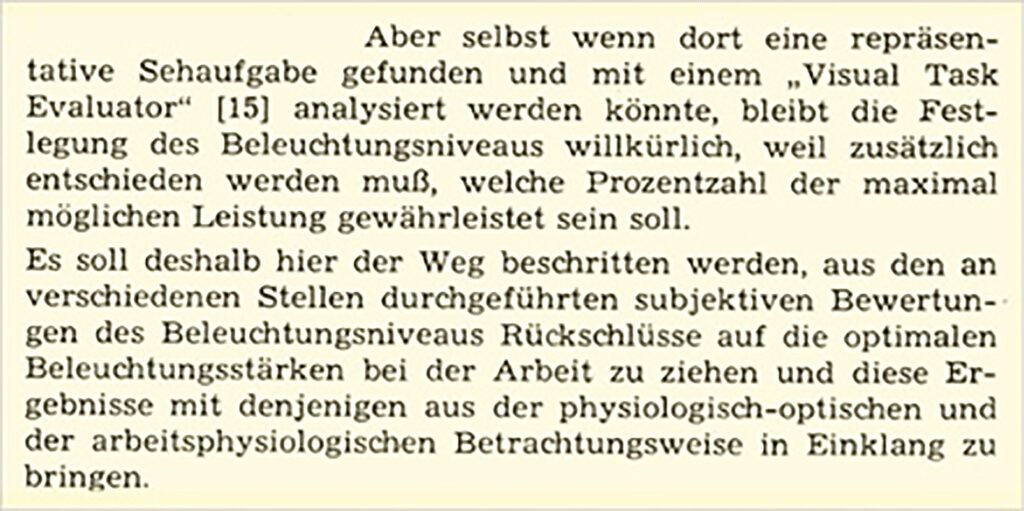 Aus den ca. 60 Jahren zwischen der abgebildeten Erkenntnis und heute ist mir nur bekannt, dass man das Alter der Benutzer und den unterschiedlichen Lichtbedarf thematisiert hat. Ansonsten normte man die Beleuchtung von Arbeitsstätten nach diesem Grundsatz, den die meisten überlesen haben: “Die Zuordnung eines bestimmten Wertes der Nennbeleuchtungsstärke zu einer Sehaufgabe bezieht sich auf normalsichtige Personen.” Nach über 50 Jahren liest man in DIN EN 12464-1: „Dieses Dokument legt Beleuchtungsanforderungen für Menschen an Arbeitsplätzen in Innenräumen fest, die den Anforderungen an den Sehkomfort und die Sehleistung von Personen mit normalen oder auf normal korrigiertem Sehvermögen entsprechen.” Abgesehen davon, dass weder Sehkomfort noch Sehleistung brauchbar definiert sind, ist mir nicht bekannt, was ein normales Sehvermögen ist. Man hat beim Verfassen der Norm halt nur die Kritik an „normalsichtigen Personen“ vermeiden wollen.