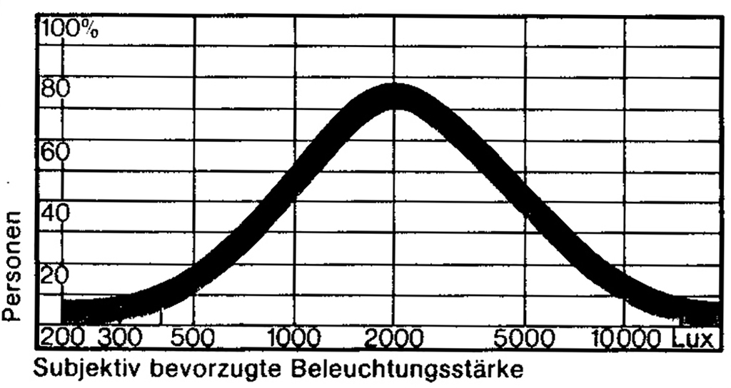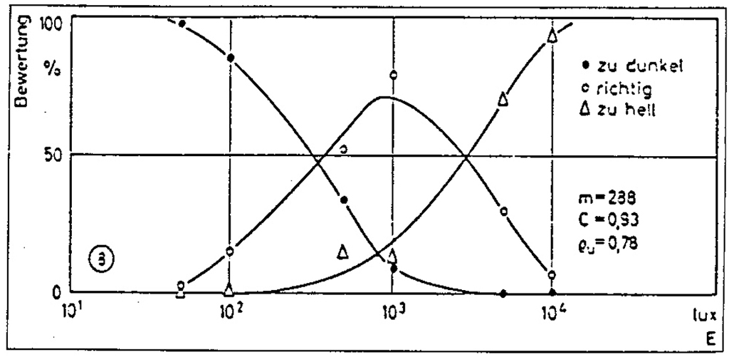 Ein analoges Vorgehen ist der Lichttechnik nicht fremd. So hat man bereits vor etwa sieben Jahrzehnten die individuell bevorzugte Beleuchtungsstärke ermittelt. Das Ergebnis sieht man in diesem Bild