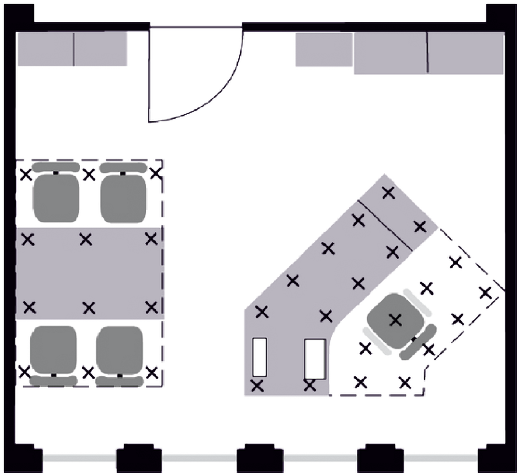 So wird die Beleuchtungsstärke in diesem Raum durch Mitteln der Werte auf den linken 16 Punkten und den rechten 20 Punkten ermittelt. Auf dem linken Arbeitsplatz befindet sich die Hälfte der 16 Punkte hinter den Benutzern. Was mag die Beleuchtung an diesen Stellen wohl für das Sehen an diesem Arbeitsplatz bedeuten?