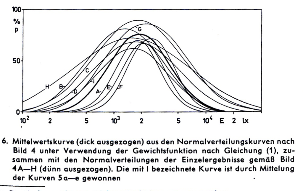 Die in dem Bild zusammengetragenen Kurven entsprechen alle einer Normalverteilung. Diese gibt es in den Originalstudien nicht. Die von Fischer zitierten Studien haben nämlich mit drei oder fünf Beleuchtungsstärken gearbeitet. Fischer postulierte daraus die dargestellten Einzelkurven, um aus allen die dick eingetragene Kurve zu zeichnen.