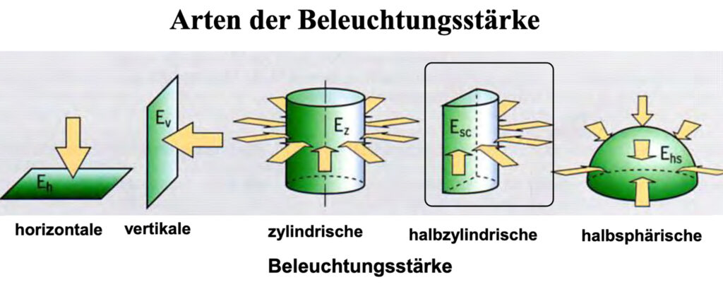 Eine besondere Art der Beleuchtungsstärke nennt sich halb-zylindrisch. Bei der Messung wird alles Licht aus einem Halbraum bewertet auf den Mantel eines fiktiven Zylinders. Das Bild macht deutlich, wofür man diese Größe braucht. Sie ist eine Zusammenrechnung der Vertikalbeleuchtungsstärken.