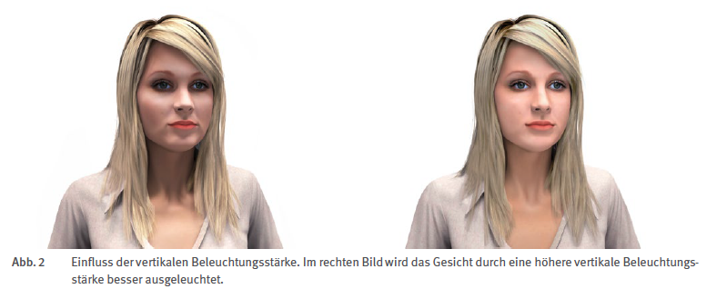 Für manche Sehaufgaben, so etwa zum Lesen von Buchrücken in Regalen oder den Warenetiketten in Hochregalen, ist die Horizontalbeleuchtungsstärke sehr unpraktisch. Deswegen gibt es die Vertikalbeleuchtungsstärke, die auch in einer Ebene gemessen wird. Diese steht vertikal, deswegen muss das Licht parallel zur Decke fliegen, um sie zu erzeugen. Früher war sie nur wegen der Zeichentische und Bücherregale wichtig,. Seit der Lichttechniker den Mediziner gibt, dient diese Beleuchtungsstärke als die Messlatte für das gesunde Licht. Die sogenannte melanopische Wirkung wird vertikal gemessen. Da sie aber nicht den ganzen Tag gebraucht wird - melanopisch soll Licht tagsüber wirken und sich abends möglichst zurückziehen - ähnelt ihre Bedeutung eher Yin und Yang als eine physikalische Größe.