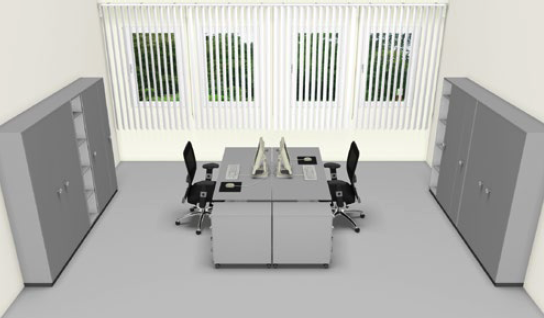 Man versuche sein Glück mit diesem Raum, der aus derselben DGUV-Info stammt. Wo müssen die Lichtquellen sitzen, damit sie auf die beiden Insassen des Raums so treffen wie in dem Bild für Ez gezeichnet. Das dürfte schwer werden, denn hinter jedem Insassen steht ein grauer Schrank, der nicht gerade viel Licht auf das Gesicht des Gegenübers wirft. Ein Lichteinfall aus der Türrichtung ist recht unwahrscheinlich. So wird jemand, der hier zylindrische Beleuchtungsstärke misst, nur das Tageslicht messen. Dafür ist die Größe wohl nicht gedacht. Wenn die Zeit kommt, zu der die künstliche Beleuchtung ihre Pracht entfaltet, schlucken die Fenster Licht, statt etwas abzustrahlen.