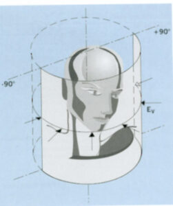 Wenn man das obige Bild durch eine weitere Hälfte ergänzt, erhält man eine zylindrische Beleuchtungsstärke. Diese wird in neueren Beleuchtungsnormen gefordert, wenn es insbesondere auf menschliche Gesichter ankommt. Wer allerdings im Lexikon von licht.de danach sucht, wird nicht fündig. Man findet dort die halbzylindrische mit einem ähnlichen Bild wie oben. Die Messung erfolgt mit einem durchscheinenden optischen Zylinder, der das Licht aus allen vertikalen Einfalssrichtungen einsammelt.