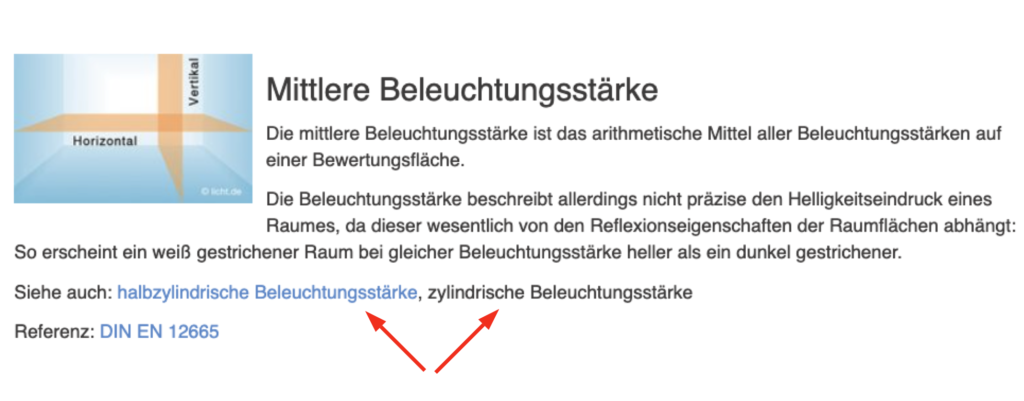 Die neuesten Normen (ISO/CIE 8995-1: 2025 und EN 12464-1:2021) geben zu jedem Arbeitsplatz einen erforderlichen Wert für die zylindrische Beleuchtungsstärke an. Die muss also sehr bedeutsam sein. Warum dies das BauNetz Wissen nicht mitgekriegt hat, verstehe ich nicht. Etwas pikanter klingt. Dass auch das Lichtlexikon von licht.de nur die halbzylindrische kennt, obwohl ansonsten die zylindrische Beleuchtungsstärke in den Beiträgen von licht.de häufig vorkommt. Vorsichtshalber füge ich einen Screenshot vom 4. März 2026 bei, der den dargelegten Umstand dokumentieren soll.