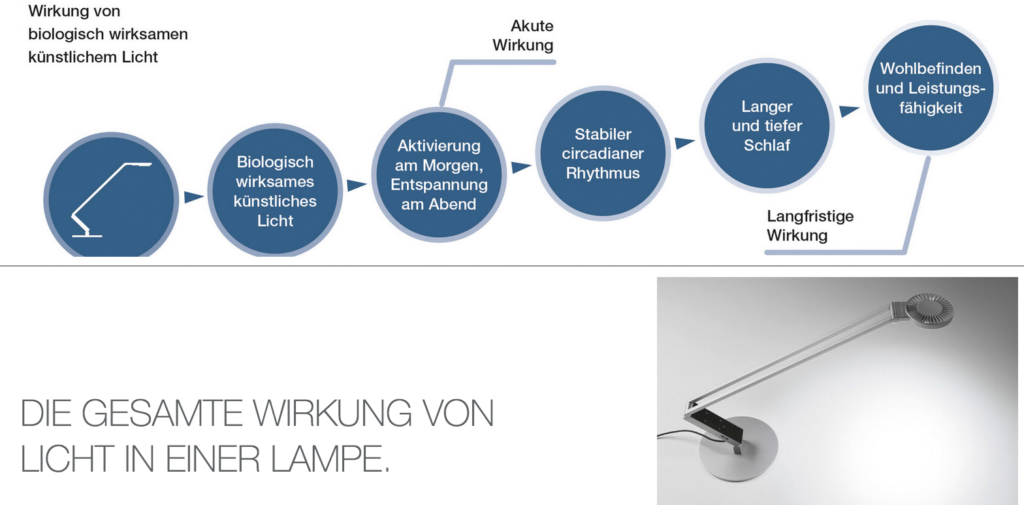 Ähnlich geht es in dem abgebildeten Beispiel einer Arbeitsplatzleuchte. Nach unseren Studien würde ich jedem solchen Produkt eine positive Wirkung unterstellen. Die hier angeführte Leuchte zeichnet sich auch noch durch ein gutes Design aus. Warum muss man für sie mit dem Argument werben, dass sie einem einen langen und tiefen Schlaf bescheren soll?