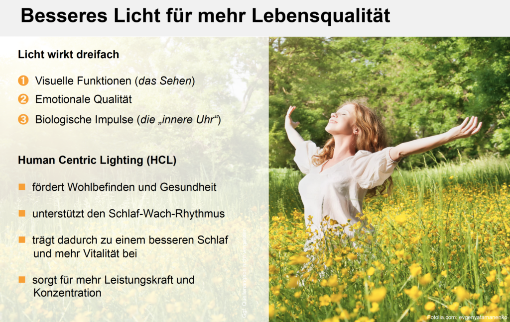 Eigentlich wird jeder Experte eins empfehlen: Das beste „Human Centric Lighting“ ist immer noch der Gang nach draußen. Selbst an einem bewölkten Tag ist die Lichtintensität im Freien (ca. 5.000 bis 10.000 Lux) um ein Vielfaches höher als in jedem optimal beleuchteten Büro (ca. 500 Lux).