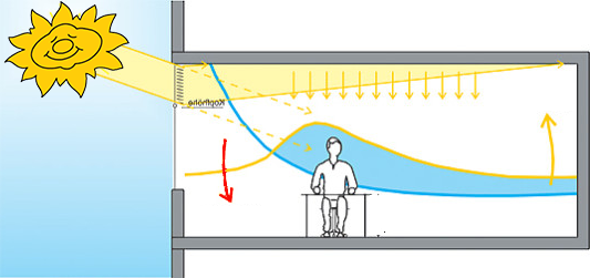 Hier sieht man ein Umlenkschwert, das etwa in Augenhöhe beim Stehen etwa einen Meter in den Raum hineinragt, dessen Reflexionen von einer Spiegelbatterie an der Decke ins Rauminnere geleitet werden. Die innere Hälfte des abgebildeten Raums entspricht der Realität von echten Büros. Dort sitzt meistens niemand. Zudem darf der abgebildete Mitarbeiter seit etwa 50 Jahren nicht mehr so sitzen, weil er geblendet wird.