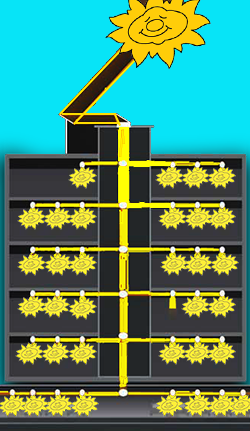 Ein Spiegel (Heliostat) auf dem Dach wird der Sonne nachgeführt und fängt deren Licht ein, das ein Netz aus (Licht-)Schläuchen durch das Haus verteilt. Dumm nur, dass Spiegel im besten Fall weniger als 1 kW Leistung pro Quadratmeter einfangen können. Jenseits der Erdatmosphäre bringt die Sonnenstrahlung es auf 1.361 Watt pro Quadratmeter (W/m²). Davon kommen mittags ca. 1.000 W/m² auf Meereshöhe an (man spricht hier von "Standard-Testbedingungen" für Photovoltaik). Über Tag und Nacht sowie über alle Breitengrade verteilt, liegt die durchschnittliche Einstrahlung am Boden in Deutschland bei etwa 115 W/m². Das reicht vielleicht für ein Zimmer in dem Gebäude, vielleicht auch nicht. (Weitere Kommentare zu der Idee unter Lichtgestalten im Wolkenkuckucksheim.