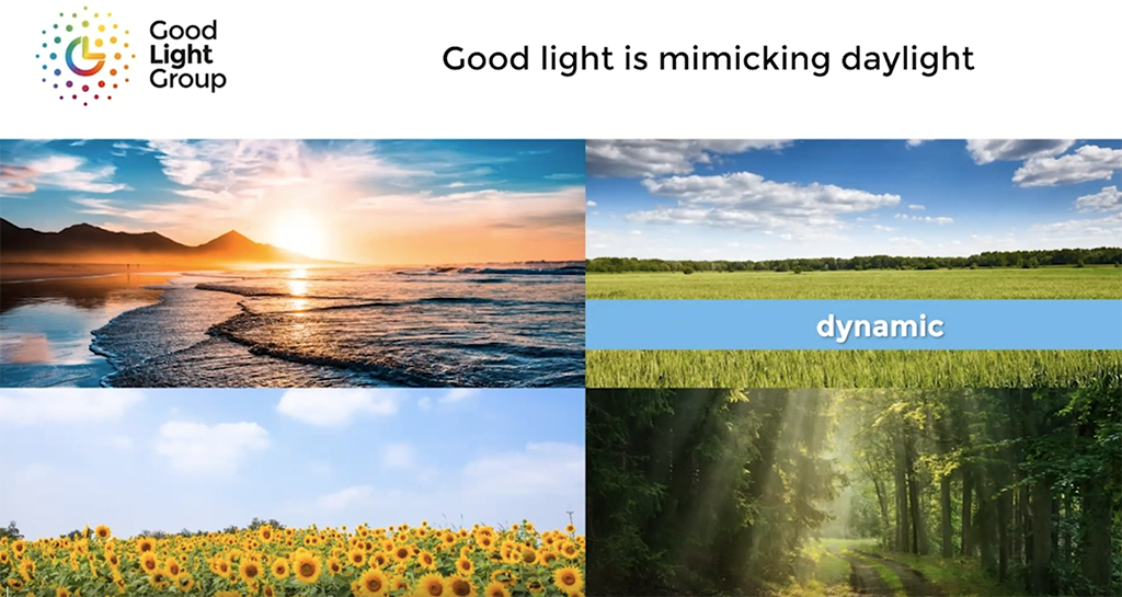 Die Good Light Group folgte mit diesen Bildern der etwas älteren Werbung für HCL, das sich Human Centric Lighting nennt. Dort kann man aber keine Lampe entdecken. Dafür aber eine Szene, die von Sonnenschutzmitteln bis Wellness Hotels viele benutzen, um einen Segen von oben zu symbolisieren.