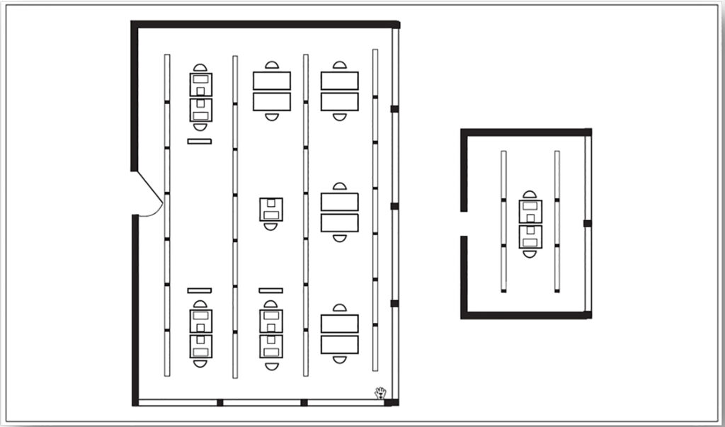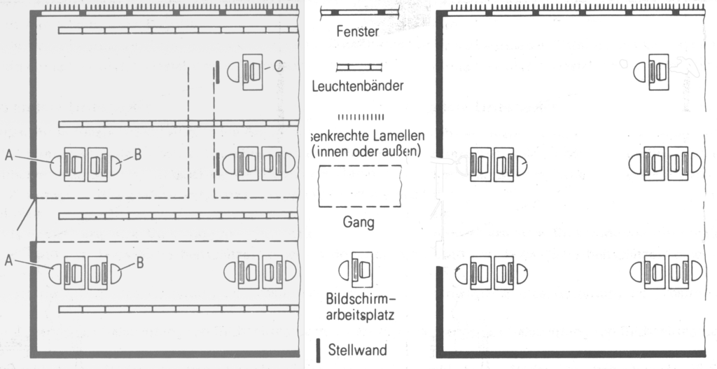 Den Raum links hingegen kann man massenweise finden. Nur nicht so möbliert. Die Normer wollten, dass alle Bildschirmarbeitsplätze im Rauminnern untergebracht werden. Und vor allem mickrig waren. Nicht, dass dies Sinn macht. Wenn andere Tische dort aufgestellt würden, würde es erkennbar sein, dass das Konzept nicht aufgehen kann. Da in realen Betrieben dieser Unsinn nicht berücksichtigt werden konnte, mussten die gestörten Mitarbeiter halt kreativ werden. Das Ergebnis steht in der Tabelle oben.