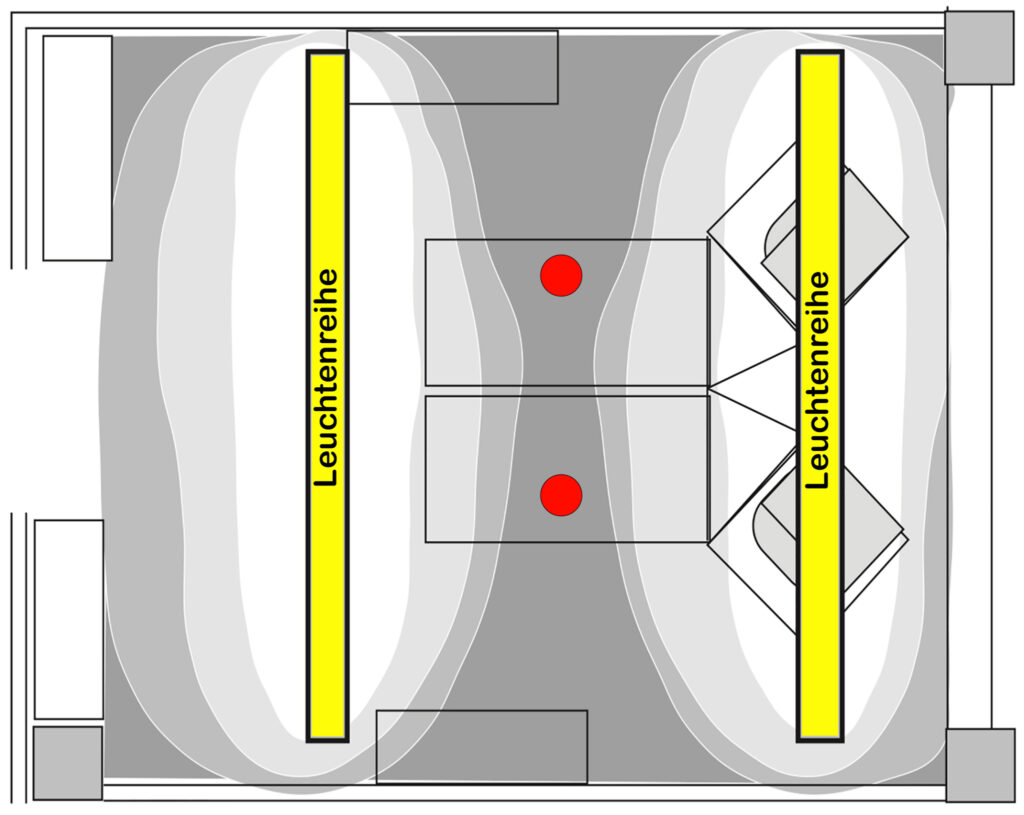 So musste man die „optimale“ Anordnung erfinden, die man auch heute überall vorfindet. Man baut eine Leuchtenreihe fast direkt am Fenster, die zweite weiter im Raum. Dumm nur, dass das Licht dann vornehmlich die Ränder des Tisches beleuchtet.