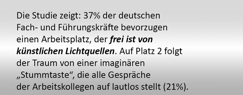 Die Antwort ist relativ einfach. Das Ergebnis der Forschungsarbeit lässt sich kurz so wiedergeben: „Die Studie zeigt, dass man tatsächlich die subjektive Gesundheit des Menschen erheblich mit Licht fördern kann. Das erfolgt weitgehend durch Tageslicht am Arbeitsplatz und eine flexible künstliche Beleuchtung.“ Damals war nach dem deutschen Arbeitsrecht Tageslicht keine Beleuchtung für Arbeitsplätze. Und eine flexible Beleuchtung war für Leute, die mit einer einzigen Norm sämtlichen deutschen Betrieben und für alle Arbeitsplätze die Aufstellung und Anordnung vorgaben, eher ein Schimpfwort.
