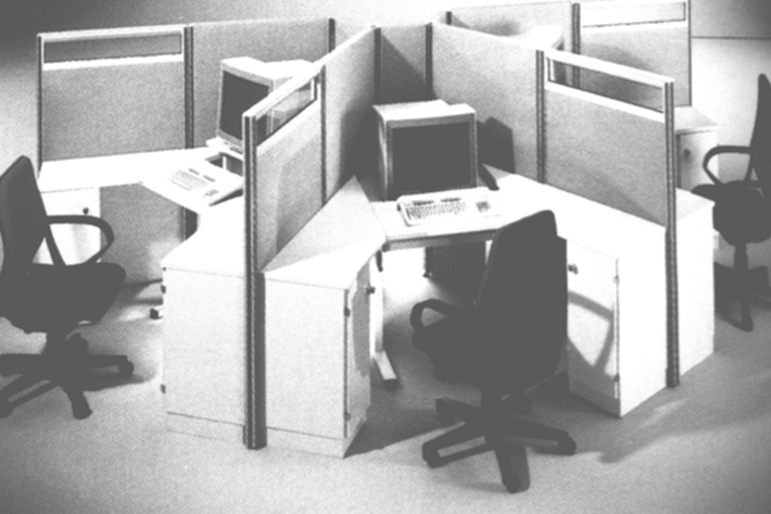 Es gab nur zwei mehr oder weniger schlechte Lösungen. Man richtet seine Zelte, sprich Bildschirm und Akte, in der Mitte zwischen den Leuchtenreihen an, wo es am dunkelsten ist. Da die Bildschirme viel Platz brauchten, bot die Büromöbelindustrie die geniale Lösung an, die sie einst nur den Sekretärinnen angeboten hatte: die Eckkombination.