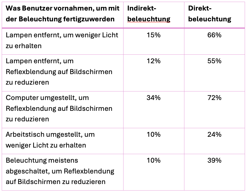 Wie man in Genesis 2.0 Schöpfung der elektrischen Sonne lesen kann, hat mein Institut mit dem Forschungsbericht Licht und Gesundheit – Eine Untersuchung zum Stand der Beleuchtungstechnik in deutschen Büros von 1990 die Sichtweise auf die Wirkungen von Licht erheblich beeinflusst. Das Ziel dieser Studie war aber nicht allein, Lichtwirkungen zu ermitteln, sondern die schon zuvor bekannten Probleme mit besseren Beleuchtungssystemen zu beseitigen.