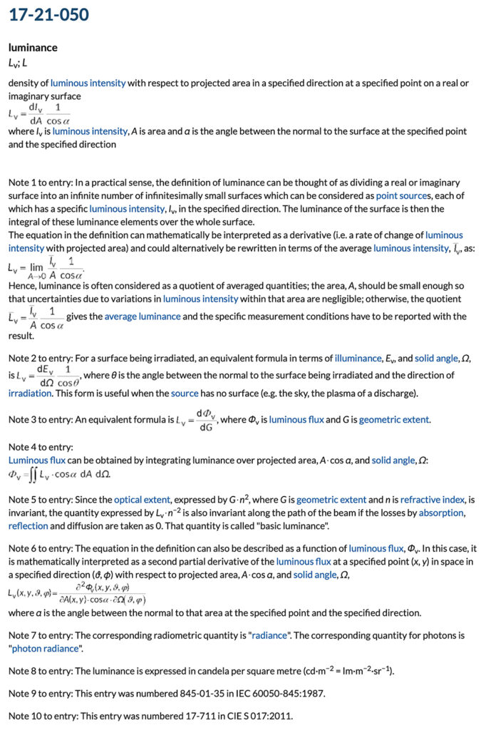 Der Leuchtdichte hingegen entspricht keine physikalische Größe, obwohl sie mit physikalischen Geräten gemessen wird. Wer genau wissen will, was sie ist, muss sich durch eine lange Definition kämpfen – und versteht am Ende … nichts. Spaßeshalber habe ich deren Definition aus dem CIE-Wörterbuch der Lichttechnik kopiert. Da sie nicht auf einen 4K-Monitor passte, musste ich das Bild verkleinern. Leider gibt die CIE selbst die Definition nicht mehr auf Deutsch (link). Hier ist das Prachtstück