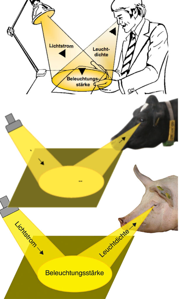 Links kommt ein Lichtstrom aus einer Lampe. Eigentlich hat er keine Richtung. Aber lassen wir das gelten. Dieser führt zu einer Beleuchtungsstärke. Eigentlich stellt das Oval keine Beleuchtungsstärke dar. Die ist nämlich gerichtet. Und daraus geht ein Strahl ins Auge des Schweins, der immer schmaler wird. Er sieht ähnlich aus wie der antike Lichtstrahl, der nach der damaligen Lehre vom Auge ausging und das Sehen ermöglichte. Wie dem auch sei, das Schwein sieht, wie die Kuh auch, nur dichromatisch, weil es nur zwei Farbempfänger im Auge hat. Menschen haben drei. Nur dafür kann eine Leuchtdichte berechnet werden. Für den Fall, dass sich Vogelliebhaber oder Aquarianer auch so ein Bild basteln: Vögel, Fische und Reptilien haben vier Farbempfänger im Auge.