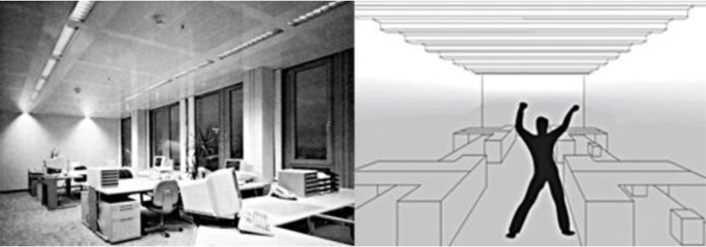 Weiterhin mussten die Bildschirmarbeitsplätze in das Rauminnere verbannt werden, was das untere Bild verdeutlicht. Einen besseren Beweis dafür, dass das Konzept während des Tages schlecht aufgeht, gibt es kaum: diese Empfehlung. Sie wirkt nur dann, wenn die dominierende Beleuchtung künstlich ist. Das ist in den meisten deutschen Büros zwischen Ende März und Anfang Oktober nicht der Fall. Wenn ein Raum ordentlich gebaut ist, braucht man in diesem Zeitraum zu 90% der Zeit kein künstliches Licht.